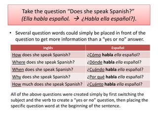 The document discusses how to form questions in Spanish using question words. It explains that yes/no questions are formed by switching the subject and verb, and questions with question words are formed the same way with the addition of the question word at the beginning. It provides examples of questions using how, where, when, why, how much, who, how many, which. Questions with who/who all and how much/how many require verb conjugation based on the subject.