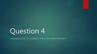 The document discusses the target audience for a music magazine. It describes conducting a survey that found the target audience would be mainly female aged 16-19 who enjoy pop punk and indie/rock music. They typically buy magazines every 3 months. Taking this into account, the magazine would be released quarterly with the first issue in July featuring content about concerts and bands they enjoy like Neck Deep. Music magazines generally target fans of the featured artist on the cover as well as loyal magazine readers interested in that genre of music.