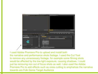 I used Adobe Premiere Pro to edit the narrative and performance footage, removing unnecessary or out of focus shots and adding cross-cutting to emphasize the narrative.