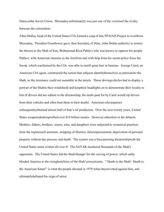 The document discusses colonialism and greed in the Middle East, specifically focusing on the 1953 CIA-orchestrated coup in Iran that overthrew the democratically elected Prime Minister Mohammed Mossadeq. The coup installed the Shah in power to further American and British oil interests, oppressing the Iranian people for decades through torture, imprisonment and death under the secret police SAVAK, which the CIA helped create. The oppression led to the 1979 Iranian revolution where the people chanted "Death to the Shah, Death to the American Satan." The coup is given as an example of how American greed and actions in the region have had severe unintended consequences, or "blowback," including the 444-day hostage crisis where Ronald