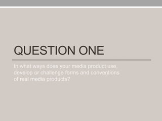 The document discusses conventions of real music videos and how the student's media product compares. It notes that typical music video conventions include various shot types, camera movements that follow artists, mise-en-scene that enhances performances, and editing/transitions. However, the student's video challenges some conventions by having atypical lighting, a lack of props, and mainly using long shots without close-ups of the dancer. While it follows some conventions like camera movements tracing the dancer, it defies conventions common for indie music videos by not featuring the artist and having atypical coloring.