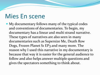 This document discusses the conventions used in the documentary "Industrial Bites" created by the author. It examines the narrative structure, use of establishing shots, interview formatting, attire of interviewees, sound elements including narration and music, editing techniques, camerawork including shots of interviews and cutaways, print advertisements comparing to "Supersize Me", and the radio trailer comparing to conventions of drawing the audience in with clips, music, and a narrator. Overall, the document analyzes how the author's documentary follows typical documentary codes and conventions to effectively inform the audience.