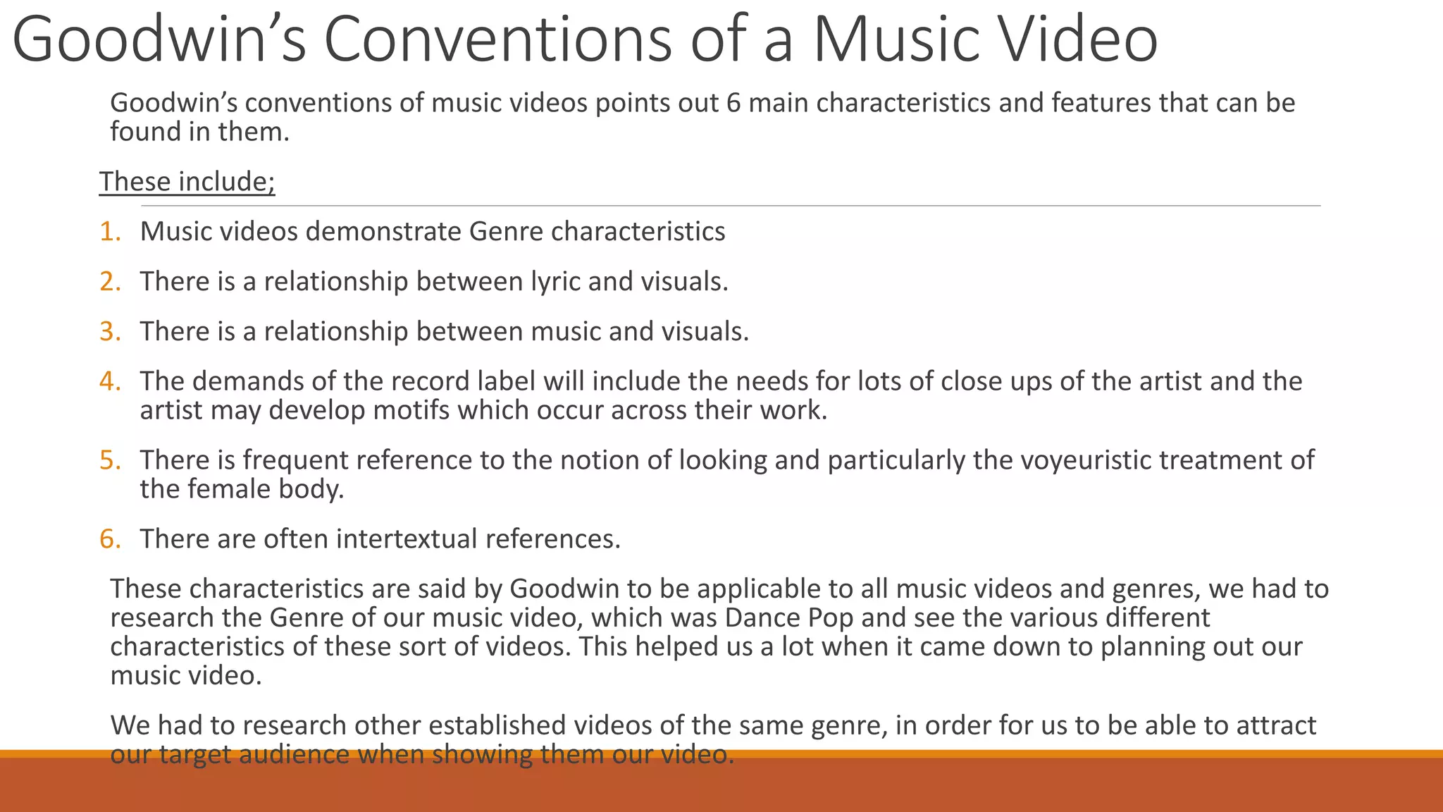 My music video challenges some conventions of music videos in the dance pop genre while adhering to others. It challenges conventions by not featuring the artists Cupid and Medusa, whereas dance pop videos typically have many close-ups of the artist. However, it adheres to conventions by showing a relationship between lyrics and visuals to tell a narrative, and by editing the visuals to match the pace of the upbeat music. While not fully conforming due to the absent artists, the video aims to attract target audiences through familiar genre tropes.