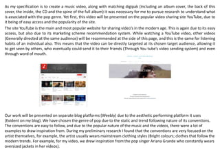 This document discusses how a media product for a pop music video and album packaging follows, develops, and challenges conventions of real pop music products.