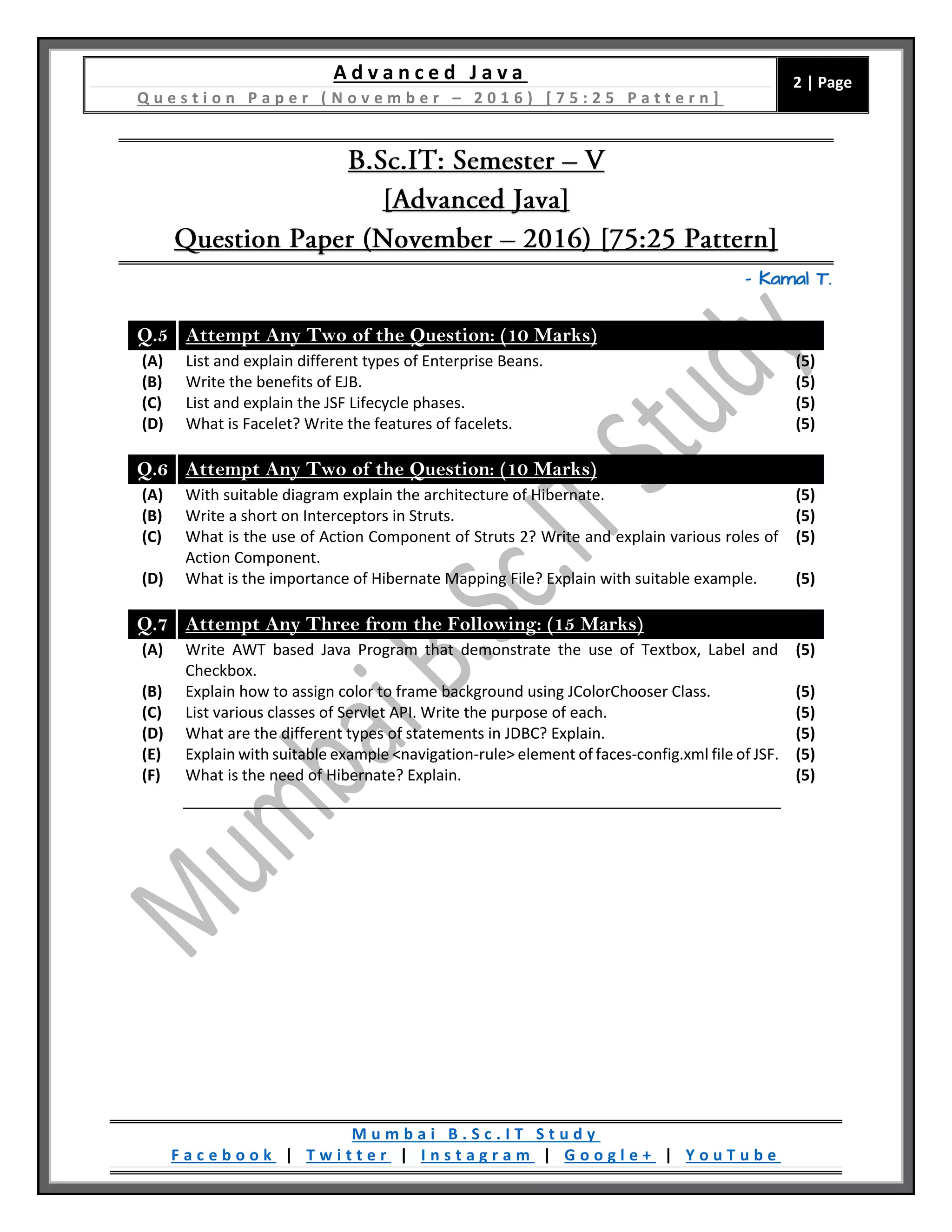 This document outlines a 75 mark, 2.5 hour advanced Java exam with 7 questions testing knowledge of Java concepts like events, layouts, swing components, servlets, JDBC, JSP, EJBs, JSF, Struts, Hibernate and more. The exam instructs students to answer any 2 out of 4 sub-questions under each main question. It provides examples of question types like explaining concepts, writing code examples, listing features and differentiating between technologies.