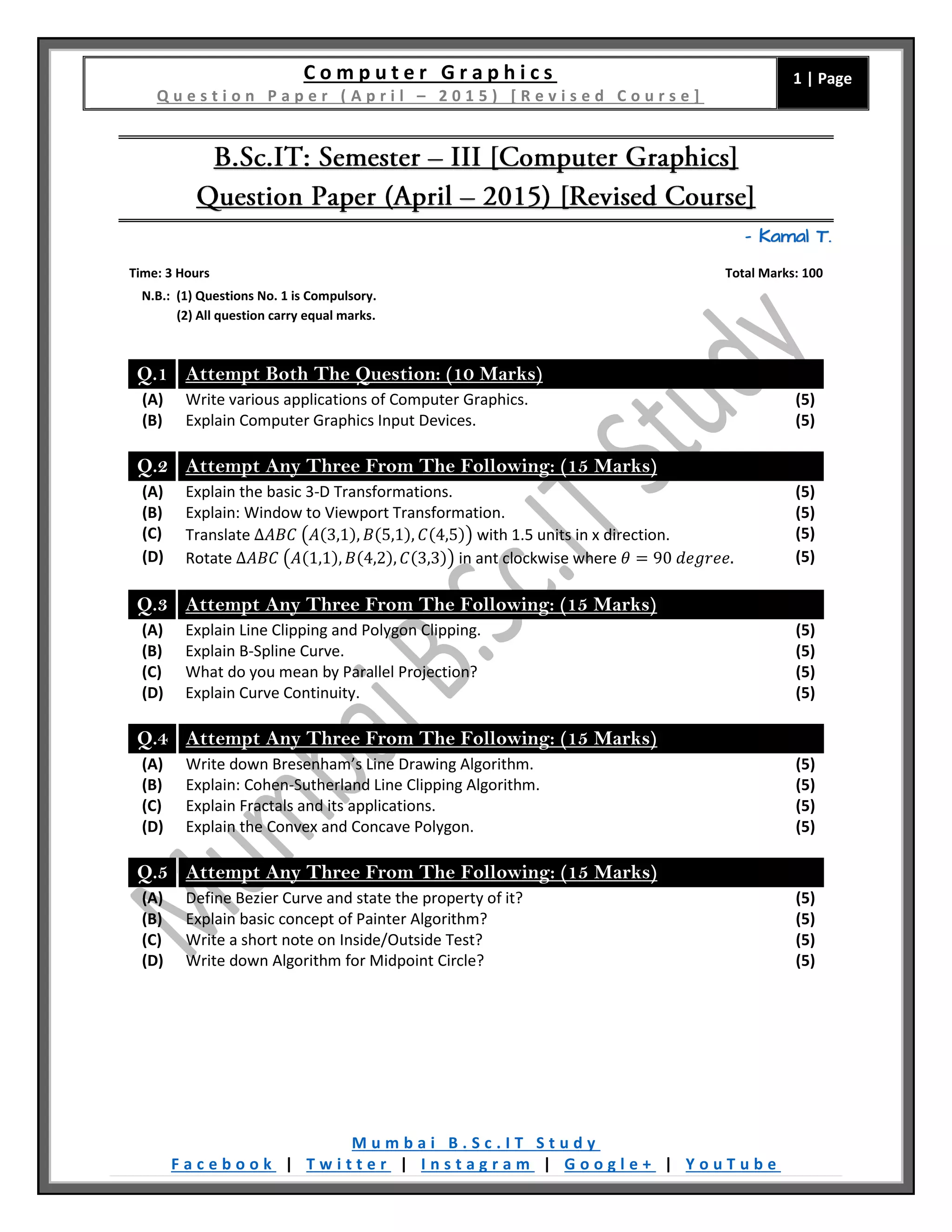The document outlines a computer graphics question paper for a course from April 2015, consisting of a structured set of questions that cover various topics in computer graphics. It includes mandatory and optional questions related to computer graphics applications, transformations, clipping algorithms, curves, and shading techniques. Each question carries specific marks, emphasizing practical applications and theoretical knowledge in the subject.