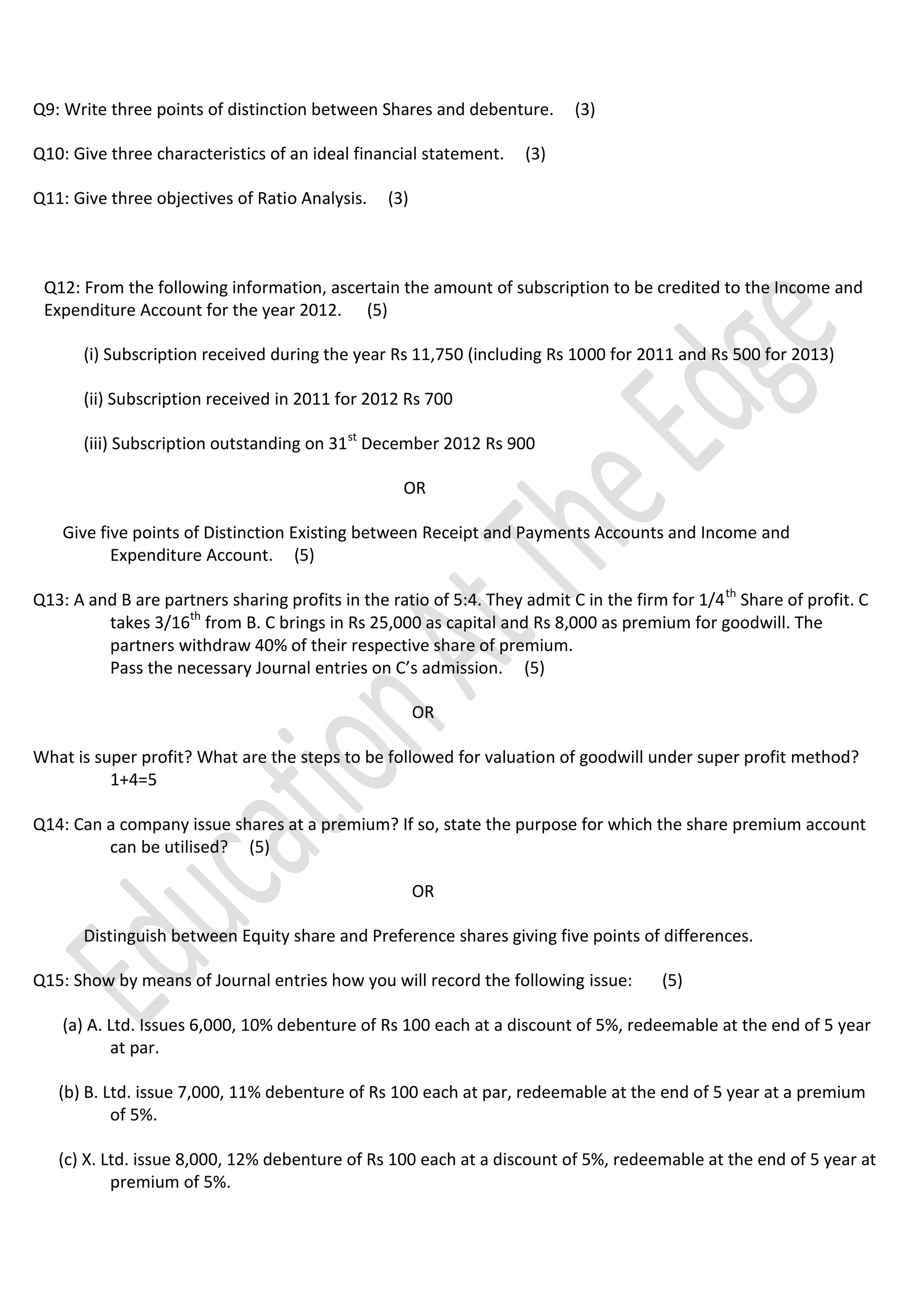 This document contains 20 multiple choice and essay questions regarding the Assam High Secondary Exam for Accountancy. The questions cover a range of accounting topics including financial statements, ratio analysis, partnership accounts, and company accounts. Students are asked to define terms, calculate amounts, journalize transactions, and prepare financial statements. The questions require knowledge of concepts like income and expenditure accounts, capital accounts, asset revaluation, partnership dissolution, and debenture issuance.