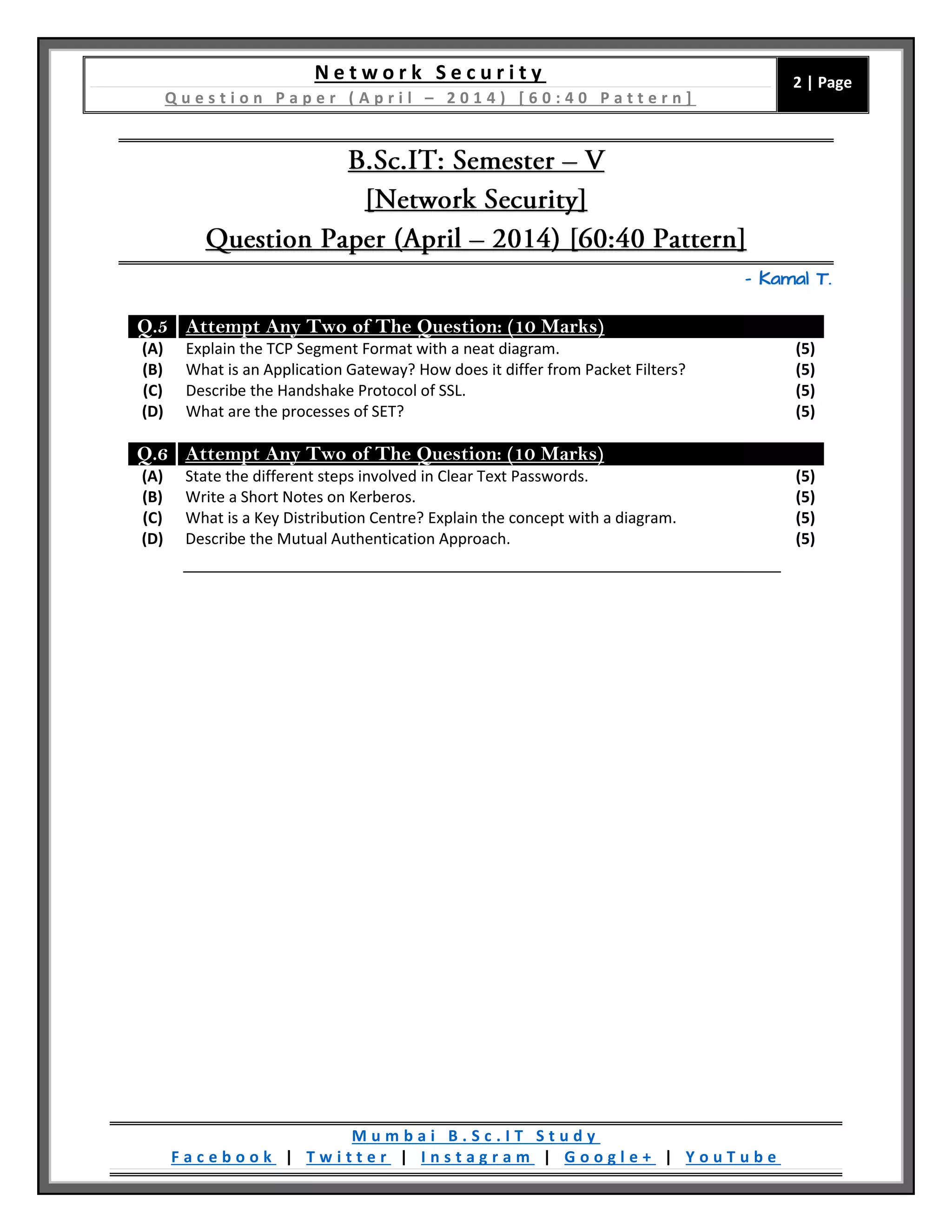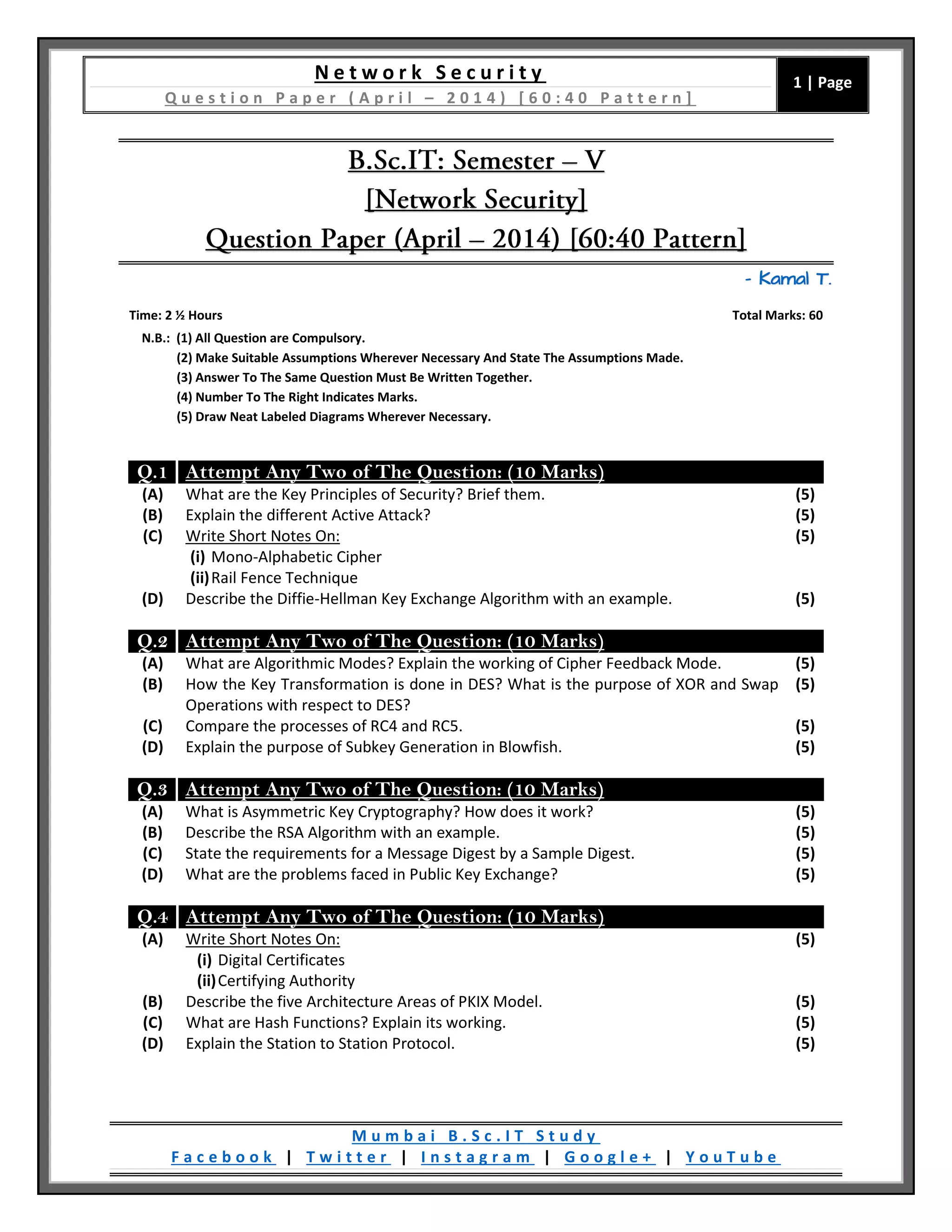 This document is a question paper for a network security exam consisting of 6 questions with multiple parts each. Students have 2.5 hours to complete the exam worth a total of 60 marks. The questions cover topics such as key security principles, encryption algorithms, public key infrastructure, hashing, protocols, passwords, and authentication methods. Diagrams should be included where necessary.