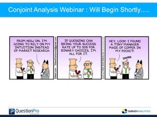 This document outlines a webinar on conjoint analysis aimed at improving business decision-making, featuring speakers from SurveyAnalytics and Zynga. It covers the methodology and application of various choice research techniques, including MaxDiff and Conjoint, while providing insights into optimizing products through market simulations and customer preferences. The session also addresses practical questions related to product naming and market competition dynamics.