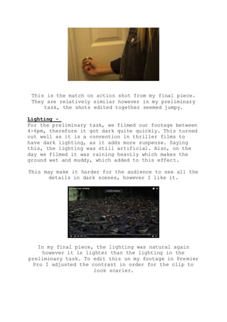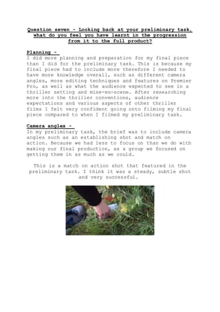 The student learned more planning and preparation were needed for their full-length film compared to the preliminary task. This included researching thriller conventions, camera angles, editing techniques, and audience expectations. For the preliminary task, filming was limited due to time and lighting constraints, and editing was challenging working in a group. For the final film, the student worked independently and focused on smoother editing, using transitions, repetition, and adjusting lighting to create tension. While mistakes occurred in both, the student gained valuable experience in skills and techniques in progressing from the preliminary task to the full film.