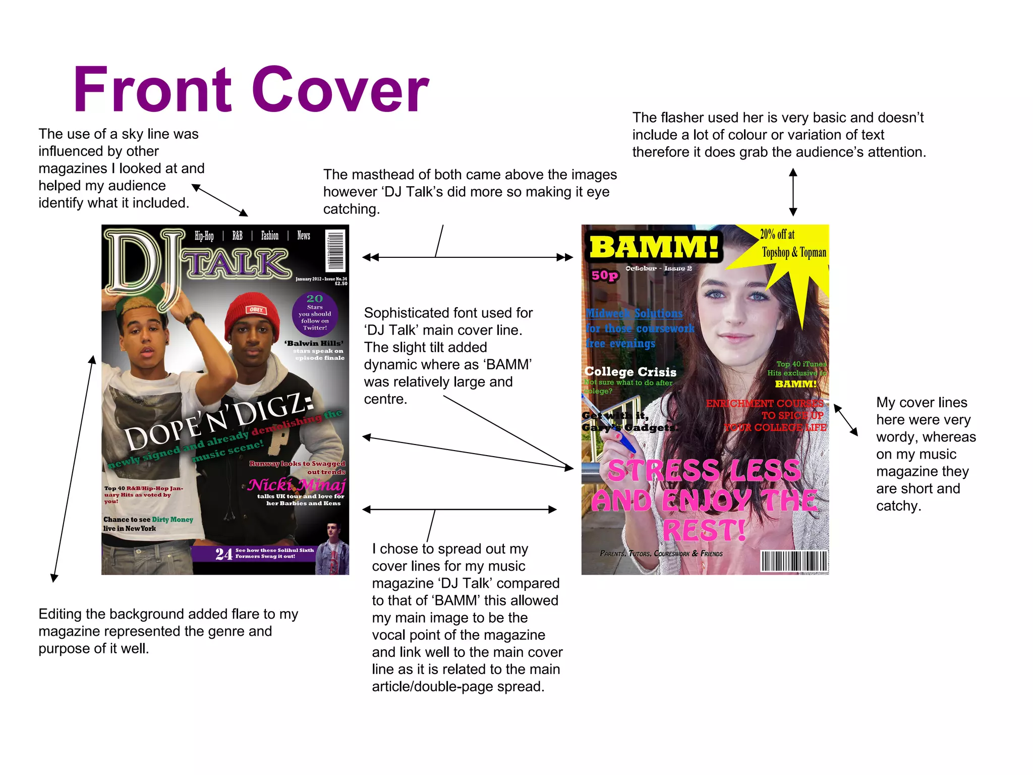 The document compares the front covers and contents pages of two magazines - "DJ Talk", a music magazine, and "BAMM". For the front cover of "DJ Talk", a sophisticated font was used for the main title, and the masthead was placed above the image, making it eye-catching. Short, catchy cover lines were used instead of wordy ones. The contents page of "DJ Talk" included more images to break up the text, used clear subheadings and boxes, and had larger page numbers for easy navigation.