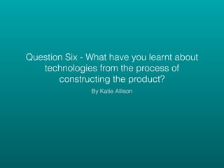 By constructing their opening film sequence, the author learned about various film production technologies and techniques. They gained experience using equipment like a DSLR camera, tripod, slider, and microphone for filming. For editing, they learned skills in Final Cut Pro like adding slow motion, rain effects, echo to dialogue, text overlays, and color grading to match footage. Overall, the process taught them about all aspects of filmmaking from planning shoots to editing techniques.