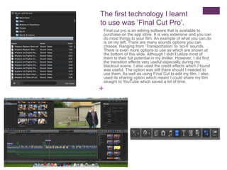 The document discusses several technologies the author learned to use while constructing a thriller film project. These include Final Cut Pro for video editing, adding transitions and credits; YouTube for uploading and sharing the finished film; Survey Monkey for creating and sharing surveys to assess the target audience; free sound websites like freesound.org and Incompetech for finding diegetic and background sounds; a Panasonic video camera and tripod for recording footage; and the class blog for organizing and storing and research and project work.