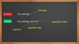 Question tags are short questions added to the end of statements to confirm information or encourage responses. Key rules for forming question tags include changing the auxiliary verb from positive to negative and vice versa, using 'will you' for imperatives, and 'shall we' for suggestions. Additional rules address cases with no direct auxiliary and the usage of 'has', 'have', or 'had' as main verbs.