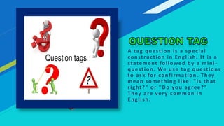Question tags are short questions added to the end of statements in English to seek confirmation or agreement. They are formed by using an auxiliary or modal verb from the statement and changing it to a positive or negative tag depending on whether the statement is positive or negative. Question tags are commonly used in speech to check facts or encourage a response and take rising or falling intonation to change the implied meaning.