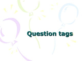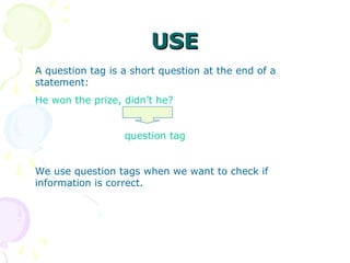 This document discusses question tags, which are short questions added to the end of statements to check if information is correct. It notes that question tags use either a negative or positive form depending on whether the statement is negative or positive. The question tag consists of an auxiliary verb and a pronoun referring to the subject. Some common verbs like "be" and "have" form question tags differently. When answering question tags, short responses like "yes" or "no" are often used. Intonation can also indicate whether the speaker is sure or unsure of the answer. In general, question tags are used to check understanding of information.