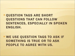 The document discusses question tags, which are short questions added to statements in spoken English to ask for confirmation or agreement. Question tags can be positive or negative depending on the statement. Positive statements take negative question tags like "isn't it?" while negative statements take positive question tags like "are you?". Examples are provided of filling in question tags after statements to form valid questions.