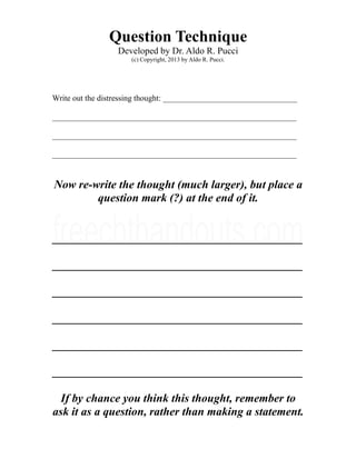 This document describes a technique called the "Question Technique" developed by Dr. Aldo R. Pucci for dealing with distressing thoughts. The technique involves writing out the distressing thought, then rewriting it as a question by placing a question mark at the end to help challenge the absolute nature of the thought. If the thought occurs again, the individual should ask it as a question rather than making it as a statement.