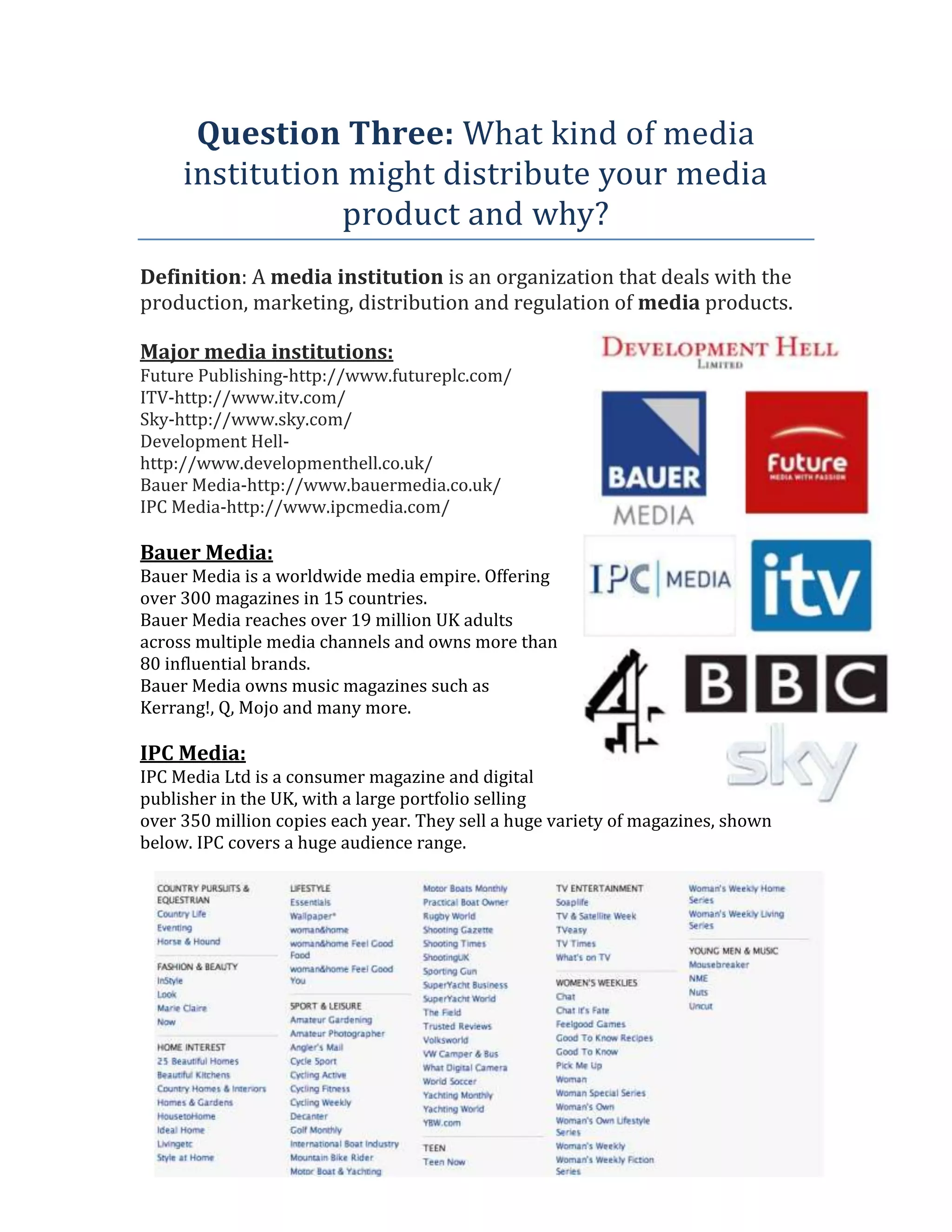 Bauer Media and IPC Media are two potential media institutions that could distribute the author's media product. Bauer Media reaches over 19 million UK adults across magazines, music, radio and digital. They own popular music magazines like Kerrang! and Q. IPC Media publishes over 350 million copies per year across a wide range of magazines. The author's magazine would appeal to teenage girls, an audience they feel Bauer Media has not fully targeted. While Development Hell is an option, distributing rock and dance magazines, they are not as well known as Bauer Media or IPC Media.