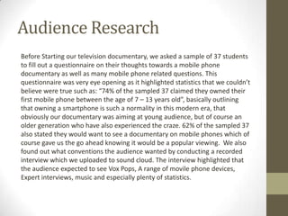 The document summarizes audience feedback from test screenings of a mobile phone documentary. Key findings include:
