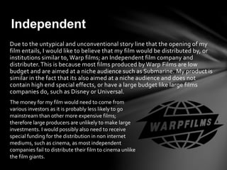 The document discusses the filmmaker's plan to distribute their independent horror film. They would seek distribution from a company like Warp Films that distributes low-budget, niche films. Social media would be important for free advertising. The film could be distributed in mainstream cinemas due to its single plotline and lack of challenging concepts, though it may find more success through online streaming services given its smaller scale. Distribution is key to building an audience and creating buzz through word-of-mouth.