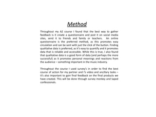Leah Aston created a questionnaire to gather feedback on a music video and ancillary tasks from their A2 course. They found that an online questionnaire distributed via social media was an effective way to easily share the survey and collect qualitative and quantitative data. The questionnaire included nine questions about various aspects of the music video and ancillary tasks like the digipak and album advert. Based on the results, most respondents had positive impressions of the music video and felt it adhered to pop genre characteristics. They also felt the editing and ancillary tasks were successful matches for the genre. However, some noted the locations in the video were confusing and the white color of the ancillary tasks didn't catch attention as well.