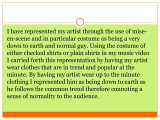 The document discusses how the representation of the artist is different between the main music video and ancillary texts. In the music video, the artist is represented as down-to-earth through everyday clothing, but in black and white ancillary images he is depicted as more mysterious with contrasting black and white. This hints at different sides to the artist's personality. Some representations, like romance, are continued between the formats by associating black and white with old movies and a handwritten font with love letters. The purpose is to show the artist has multiple facets and can be submissive in one context but dominating in another.