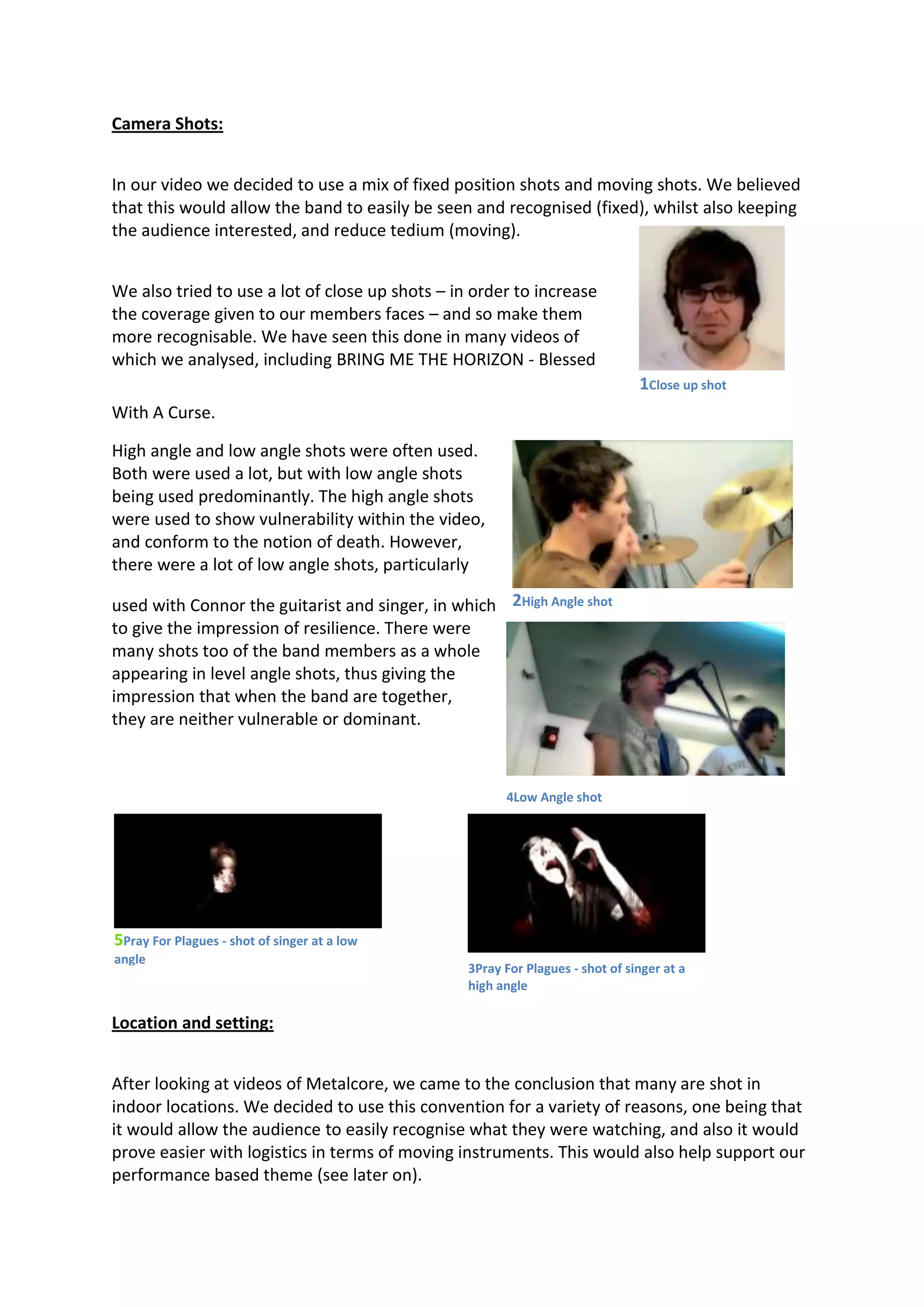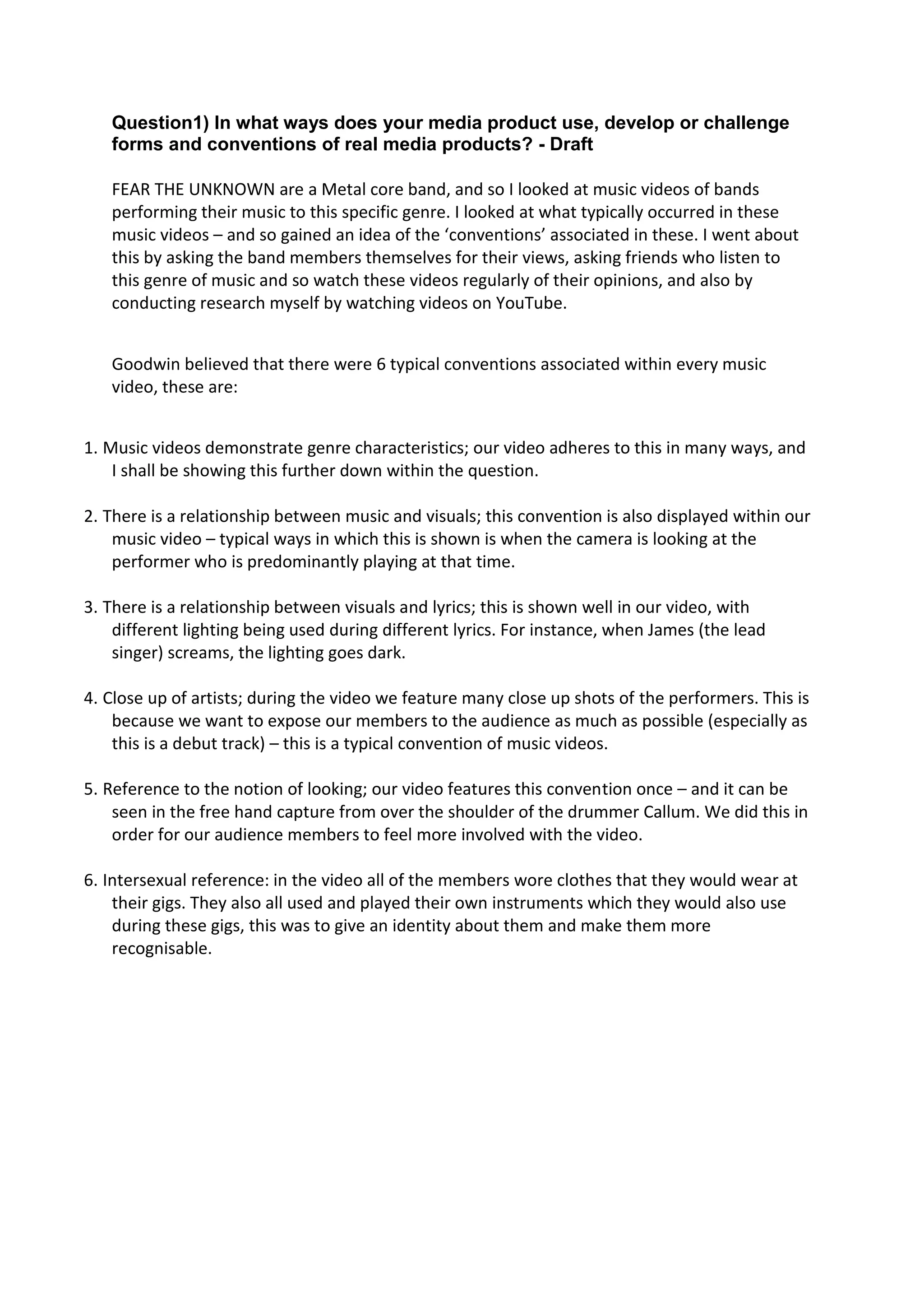 This document analyzes how a metalcore band's music video uses and develops conventions of the genre. It examines conventions like demonstrating genre characteristics, having a relationship between music and visuals, close-ups of artists, and being performance-based. The band's video adheres to many conventions, like being shot indoors and having fast-paced editing. However, it also challenges some conventions through its "cartoon" lighting effect, members' casual clothing, and not including a band photo in the print material. The document aims to balance conforming to audience expectations while also making the band stand out.