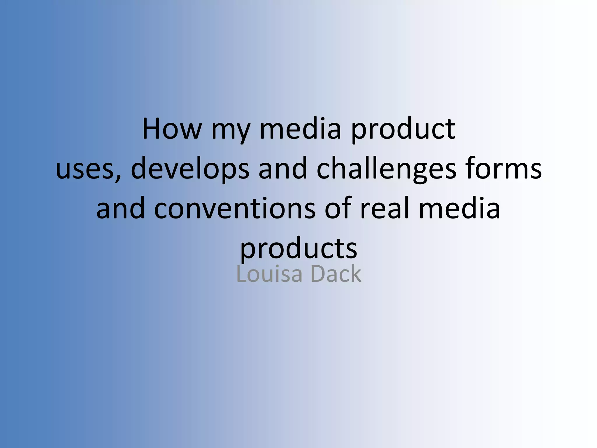 The document discusses how the filmmaker's media product uses and challenges conventions of real media genres. It provides examples from shots in the filmmaker's short film. Shots are discussed that incorporate dark filters, lighting, angles, and compositions to create tension and unease as is common in horror films. However, the film also includes elements of social realism genre through its portrayal of everyday settings and characters. The filmmaker aims to surprise the audience with a twist at the end, as is a convention of short films and social realism genre.