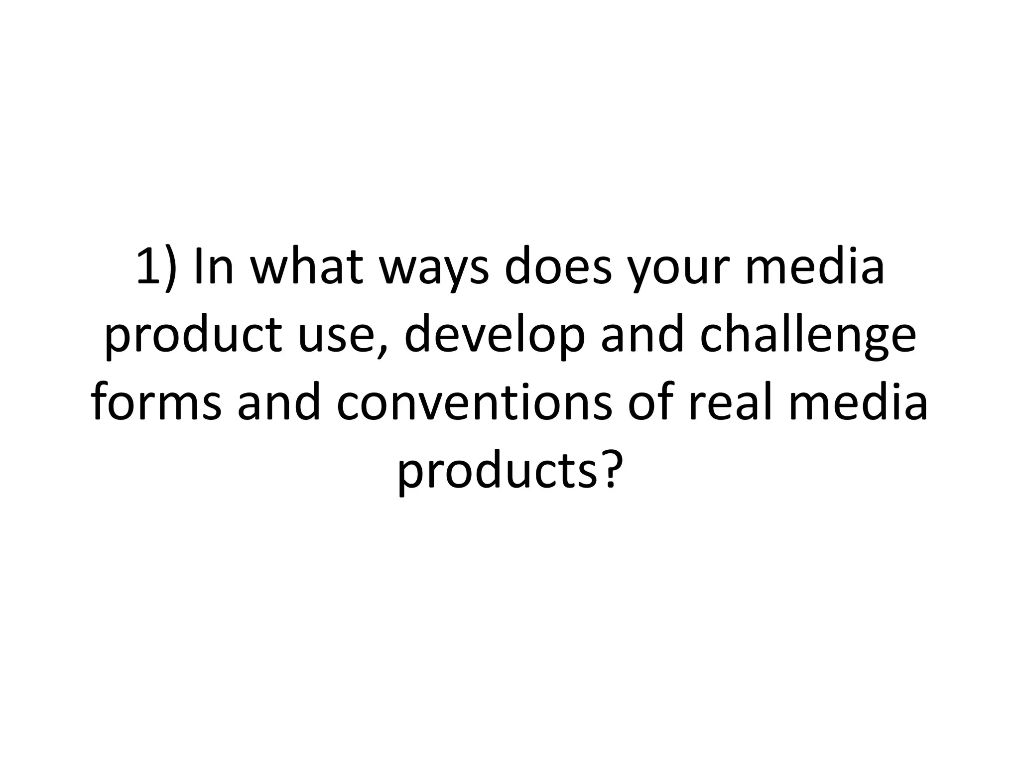 Our documentary product uses several conventions of real media documents but also develops and challenges some conventions to fit our social networking theme. We use lower third titles to identify interview subjects, placing them in a Twitter 'tweet box' graphic. We conform to the rule of thirds by placing subjects in the left or right third of frames. For mise-en-scene, we feature computers and social media items in interviews to emphasize our theme, varying from documentaries using only green screens. We also use a solo 'voice of God' narrator but make the narrator younger to appeal to our target audience. However, we challenge the use of Chromakey in interviews, instead using screen captures for a more realistic feel.
