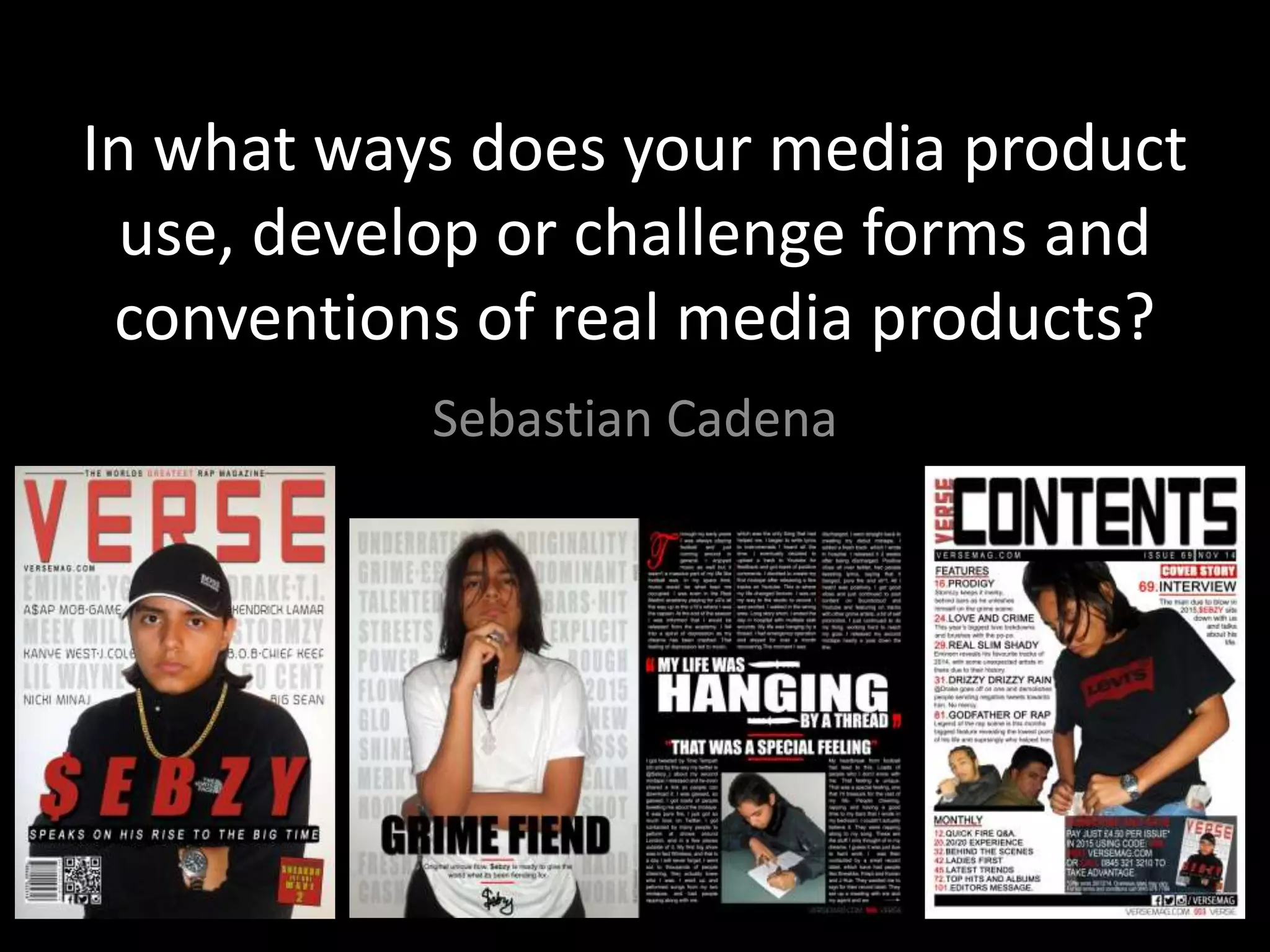 - The front cover uses conventions like a bold headline, focusing attention on the cover model, and encoding the rap genre through poses and clothing.