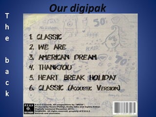 - Doodles were extensively used on the digipak for visual interest and connection to the video's classroom theme. This challenged conventions