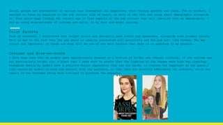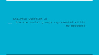 This document analyzes how social groups are represented in a music magazine product. It discusses focusing the magazine on pop culture and the teen/young adult demographic. Color palette, costumes, mise-en-scene, and fonts were chosen to attract this audience. Bright colors, high key lighting, positive facial expressions, and eye contact in images were used. Large, bold fonts in multiple colors and a distinct serif masthead font were selected to draw viewers in. The primary target audience is identified as predominantly female aged 15-24 interested in pop music and fashion.
