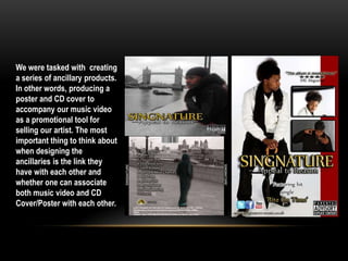 The document discusses how effectively the main music video product and accompanying ancillary texts of a poster and CD cover were designed to promote an artist. Key points made include: