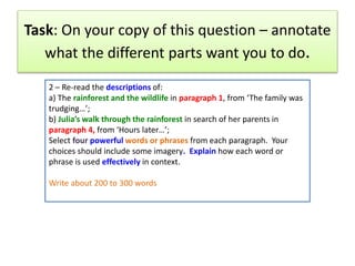 This document provides guidance on how to answer Question 2 from an IGCSE exam, which asks students to identify and explain powerful words and phrases from two paragraphs that describe a rainforest setting. It offers tips for close reading and selecting imagery from the text, and recommends approaches like L-ICE (Literal, Implicit, Connotations, Effects) for analyzing chosen words and phrases concisely in a 200-300 word response.