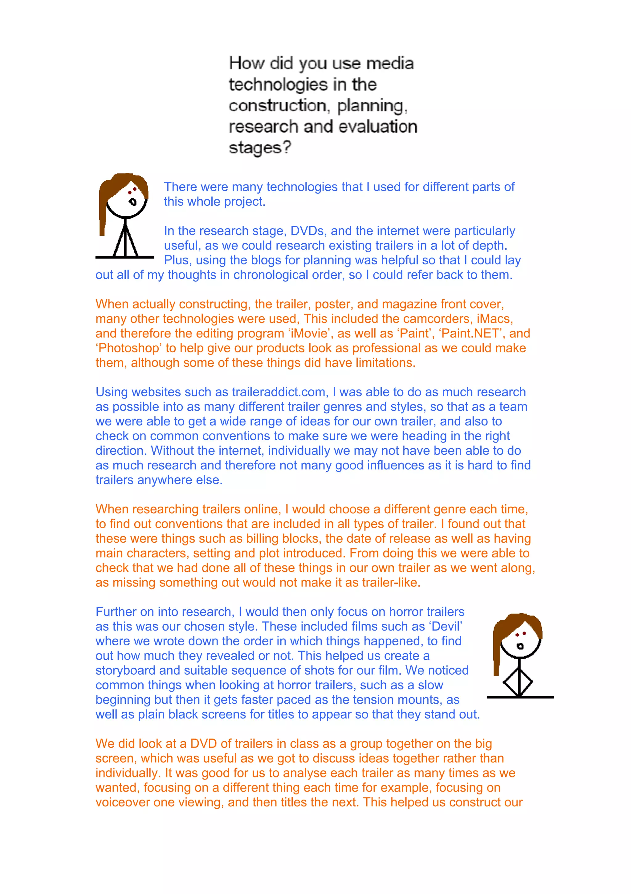 The document discusses the various technologies used at different stages of a film project. DVDs and the internet were used for initial research. Blogs helped plan the project by laying out thoughts chronologically. Camcorders, iMacs, and editing software like iMovie were used to construct the trailer, poster, and magazine cover. Photoshop and Paint.NET helped design the poster and magazine drafts. iMovie was crucial for editing shots and adding effects to the trailer. While many technologies were useful, some had limitations for the tasks needed.