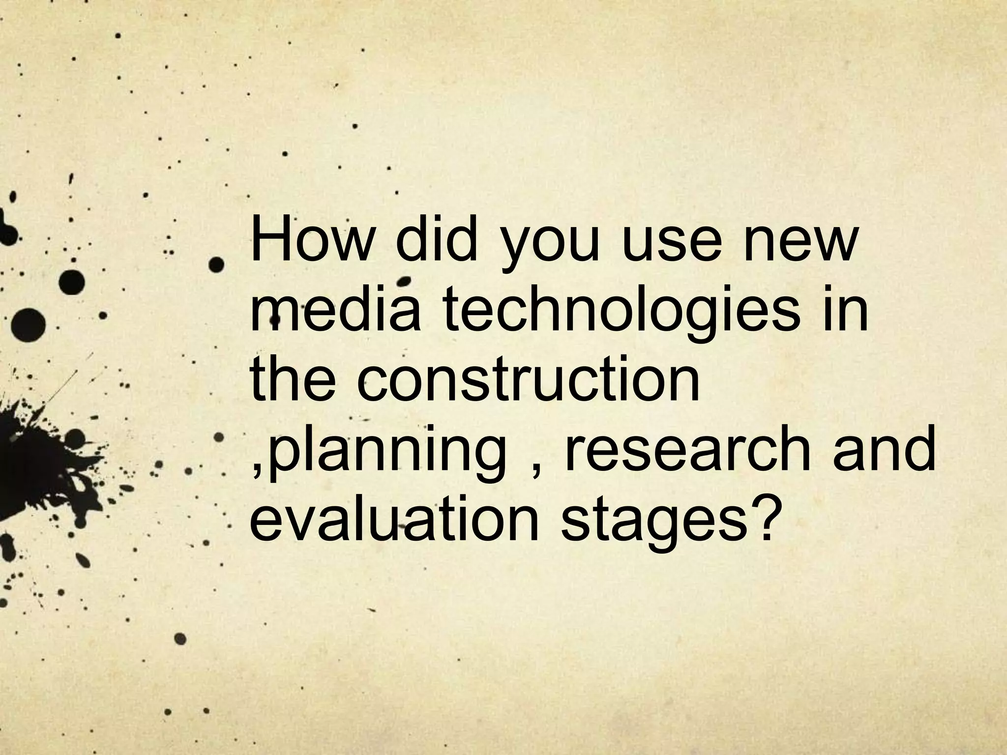 The document discusses the various new media technologies used during the construction, planning, research, and evaluation stages of a music video project. These included Unsigned.com for finding music, Google for planning and research, SlideShare for uploading presentations, SurveyMonkey for collecting feedback, Blogger for blogging, YouTube for testing ideas and finding examples, HD cameras for filming, Bluetooth and Blackberries for sharing photos, Final Cut Express for editing, Microsoft Word and PowerPoint for creating collages and presentations, iMacs for running programs, and Photoshop for designing posters and digital packages.
