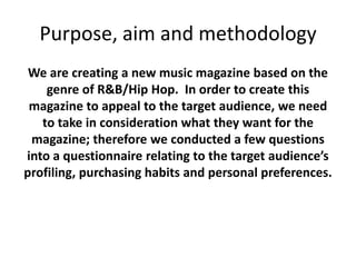 The document summarizes the results of a questionnaire about preferences for a new music magazine targeting audiences interested in R&B and hip hop. Key findings include: