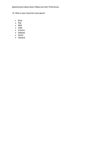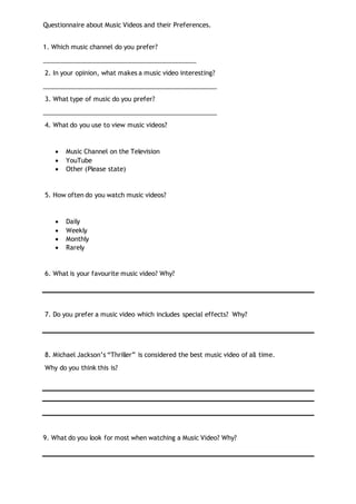 The document is a questionnaire designed to gather information about preferences regarding music videos. It includes questions about favorite music channels, types of music, viewing habits, and personal opinions on specific music videos, including elements like special effects. The questionnaire aims to identify trends and preferences in music video consumption among respondents.
