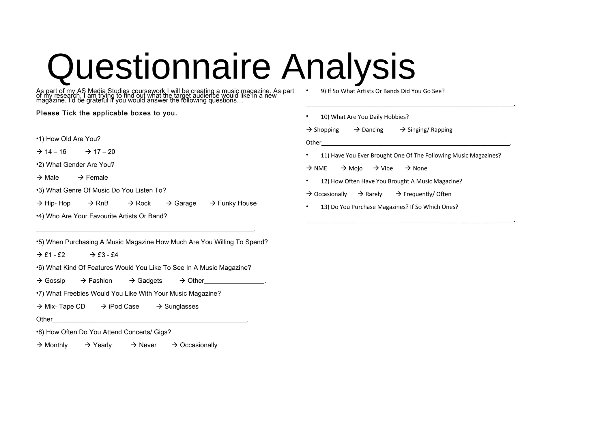The document is a questionnaire for research into the target audience for a new hip-hop music magazine. It contains 13 questions about the respondent's age, gender, music interests, spending habits, preferred magazine features, and current music magazine purchasing behaviors. The respondent will use the answers to learn that the primary target audience is 14-16 year olds, most listeners prefer hip-hop and R&B music, and the top feature interests are gossip and the inclusion of freebies like mix tapes or accessories.