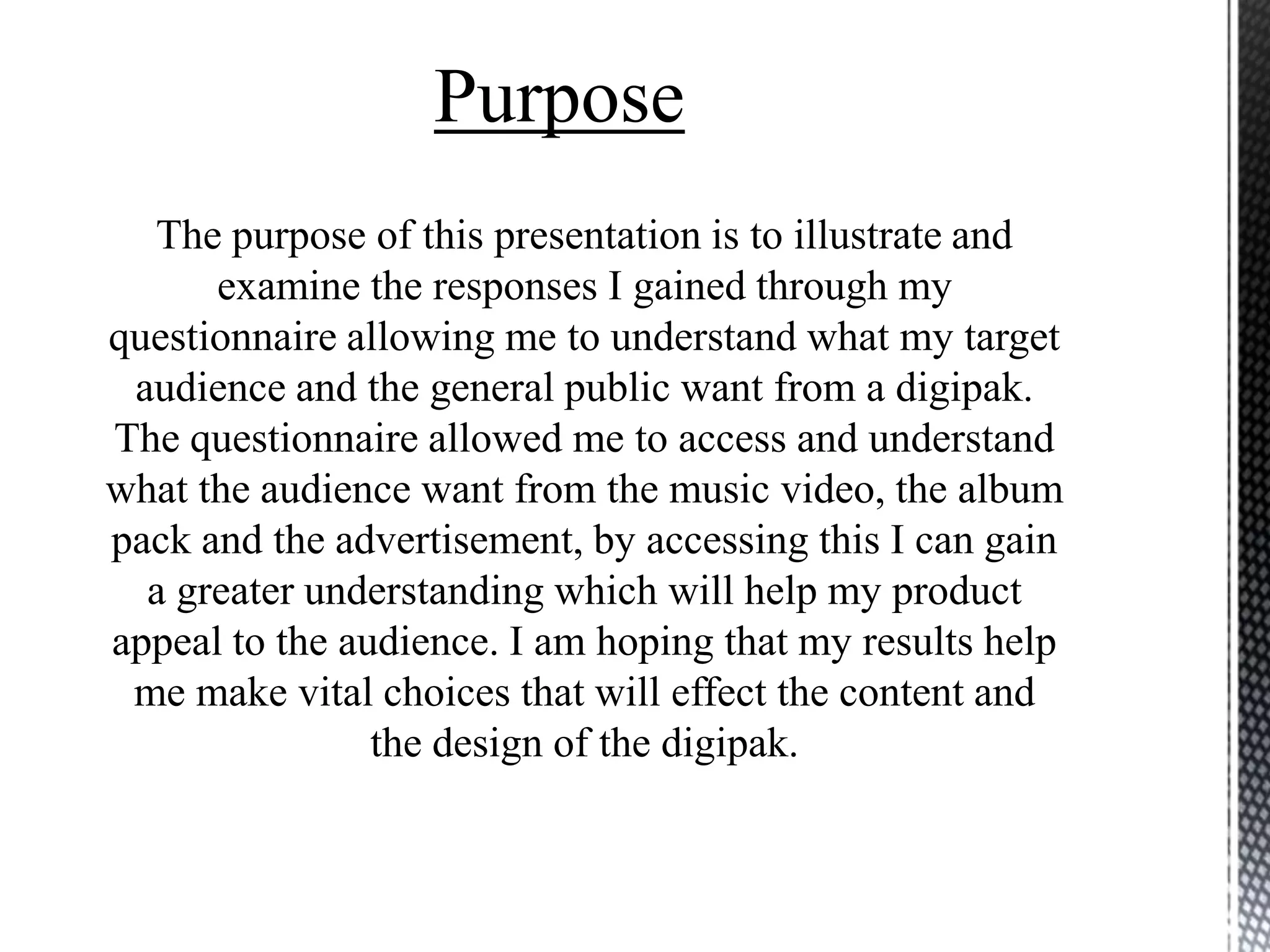 The document summarizes the results of a questionnaire given to understand the target audience for a music digipak product. Key findings include: