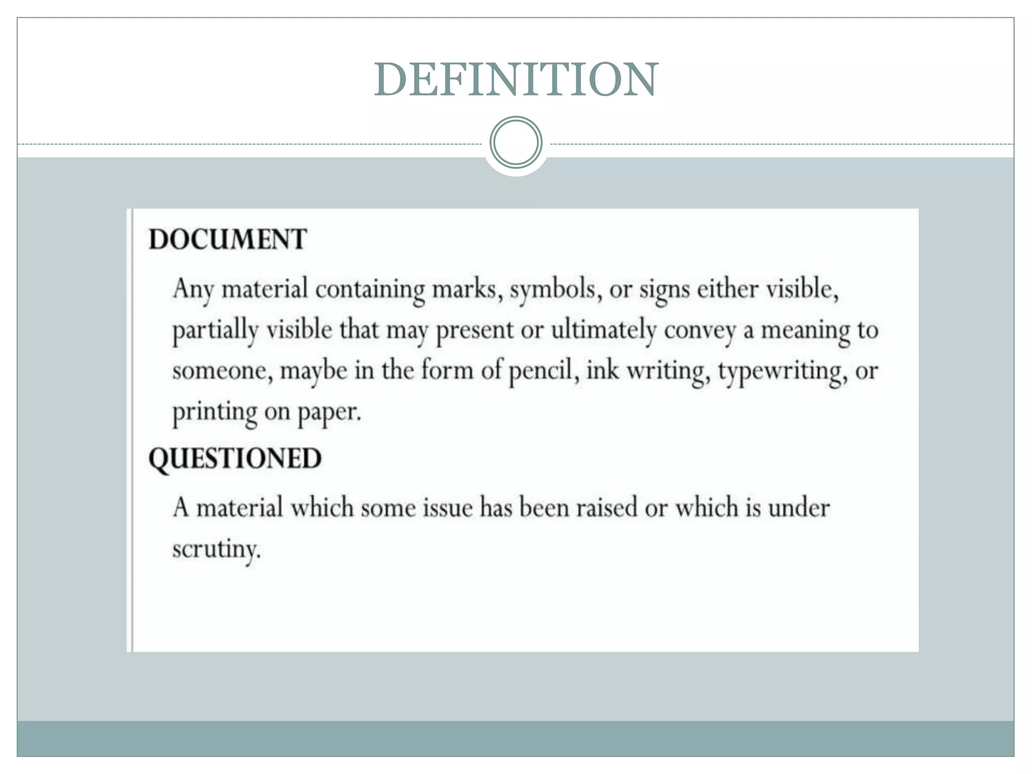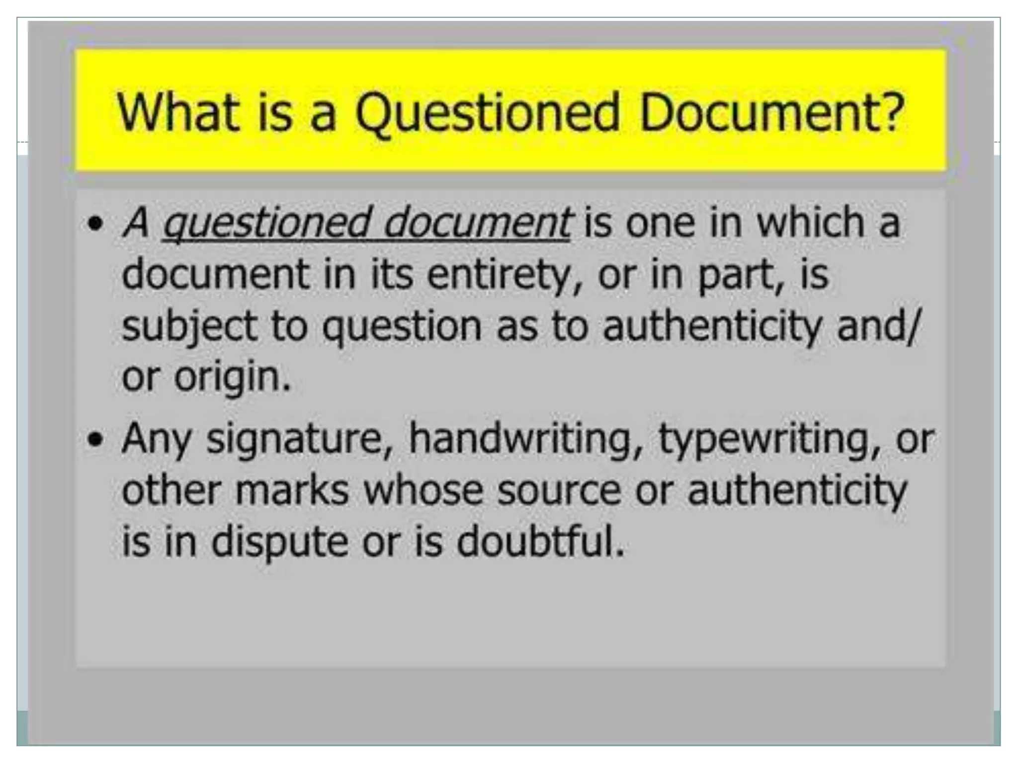 This document defines and categorizes different types of documents that may be subject to questioned document examination. It outlines public documents, official documents, private documents, commercial documents, electronic documents, paper-based documents, and holographic documents. It also defines key terms including questioned documents, questioned document examination, forensic document examiners, and reference collections.