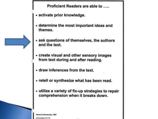 This document provides information about implementing close reading strategies with students. It discusses using post-it notes and guided highlighted reading when doing a close analysis of texts. Examples are given of setting a purpose for reading, doing an initial independent reading, and then revisiting the text through a teacher-led discussion using text-dependent questions. The goal is to help students engage deeply with texts through multiple exposures and discussions.