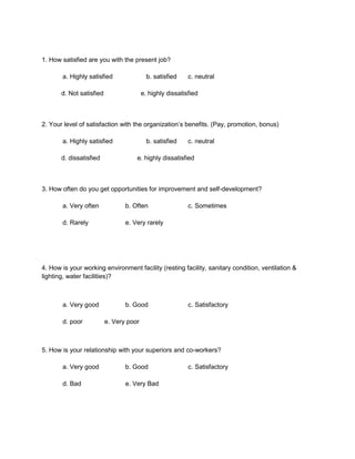The document outlines a survey given to employees at Eminent Business Solutions to assess employee morale. The 20 question survey gathered information on demographics, job satisfaction, benefits, work environment, relationships, responsibilities, independence, policies, workload, work-life balance, creativity, challenges, skills development, goal setting, appreciation, suggestions, health & safety, job security, and involvement. The purpose of the survey was to better understand employee satisfaction and morale to identify areas for improvement at the organization.