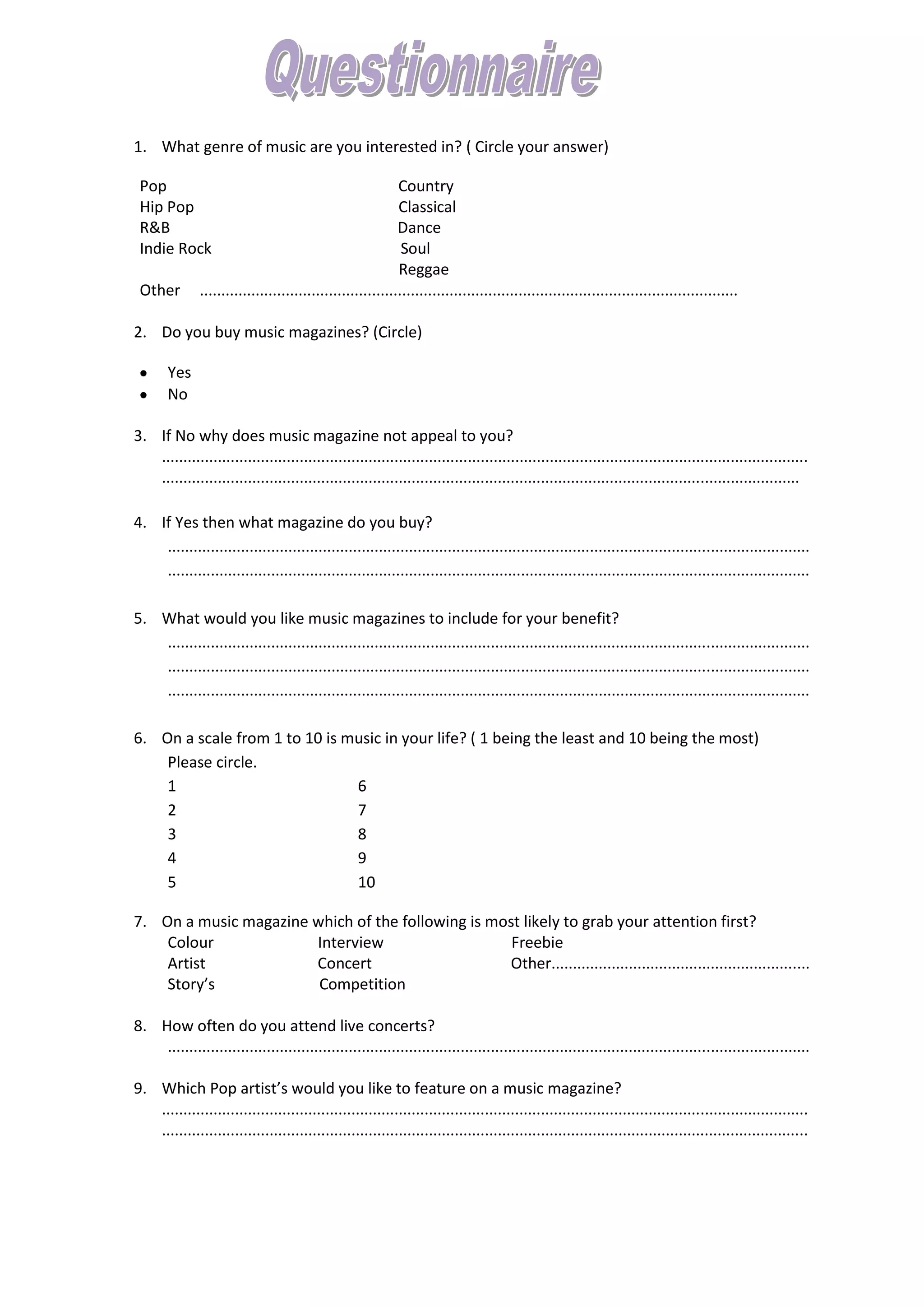 The document is a survey that asks respondents questions about their music preferences and habits, including their favorite music genres, whether they buy music magazines, what they look for in music magazines, how important music is in their life, what grabs their attention on music magazines, how often they attend concerts, and which pop artists they would like to see featured. It contains 9 multiple choice and open-ended questions.