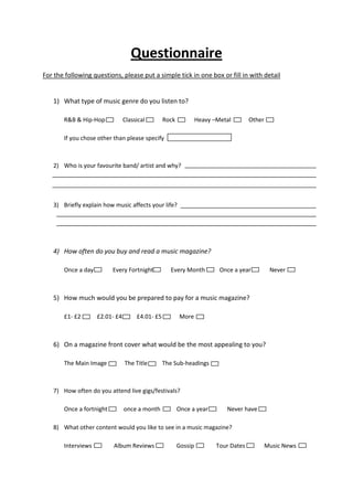 The document is a questionnaire for a music magazine that asks respondents about their music preferences and habits. It asks what music genre they listen to, their favorite band and why, how music affects their life, how often they buy music magazines and for how much, what is most appealing on magazine covers, how often they attend live music events, and what other content they would like to see in music magazines. The questionnaire uses multiple choice and short answer questions to gather information on readers' tastes and interests.
