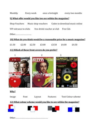 The document is a questionnaire for a music magazine audience to provide feedback on what they want the magazine to include. It asks about demographics of readers, purchasing habits, preferred price, and design elements like cover style, fonts and features. It aims to tally the results to help shape the magazine format, price and content to match reader interests.