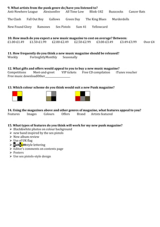 The document is a questionnaire aimed at gathering feedback to help design a new punk music magazine. It contains 15 questions regarding the respondent's demographics, music interests, current magazine purchasing behaviors, and preferences regarding price point, release frequency, bonus offers, design aesthetics, and desired article types for the new magazine. The questions are meant to provide insights into what would appeal to the target audience for this new publication.