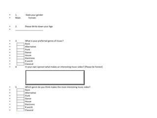 This document is a 5 question questionnaire asking the respondent for their gender, age, preferred music genre, opinion on what makes an interesting music video, and which genre makes the most interesting music videos. The respondent is asked to select their gender and preferred genre from a list and to write in their age and opinion on music videos.