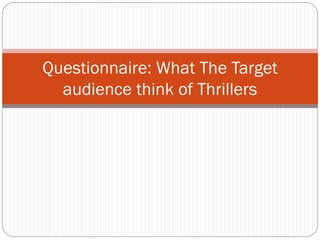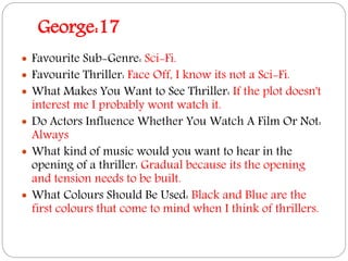 This document contains responses from 7 individuals to questions about their preferences and opinions regarding thriller films. Their favorite thriller subgenres include sci-fi, action, horror, and crime. Common favorites cited are Face Off, Taken, Psycho, and Point Break. Most said plot was very important in motivating them to see a thriller. Opinions varied on the influence of actors, with some saying yes and others no. Suggestions for music to open thrillers included gradual, fast-paced, jumpy, and creepy/sharp. Colors like black, red, blue, white and dim were deemed fitting for thrillers.
